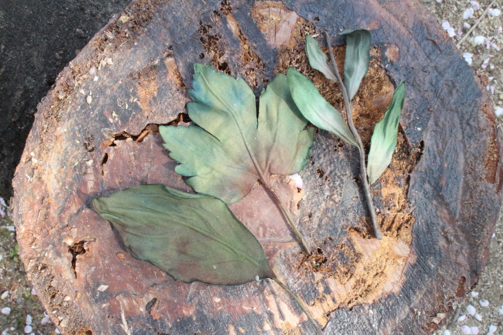 木々の葉や草の形を白い布に写し、染料や絵の具で染めてもう一つの「形」をつくります。