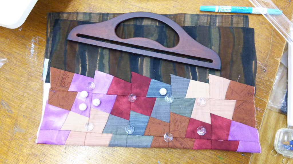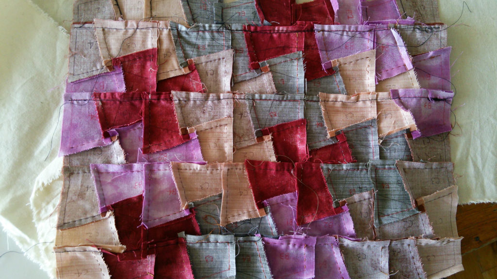 パッチワーク部分は手縫い。全体はミシンで縫った。縫い合わせていくうちに柄が広がっていくのが楽しい。布にアルファベットと番号を振り、区分けして縫い合わせている。