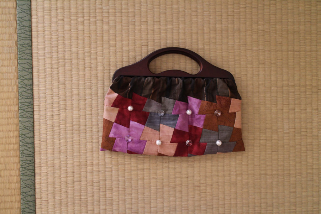 本作は、異なる質感と色合いをもつ裂布を幾何的に縫い合わせ、立体的な袋物として構成したパッチワークバッグである。