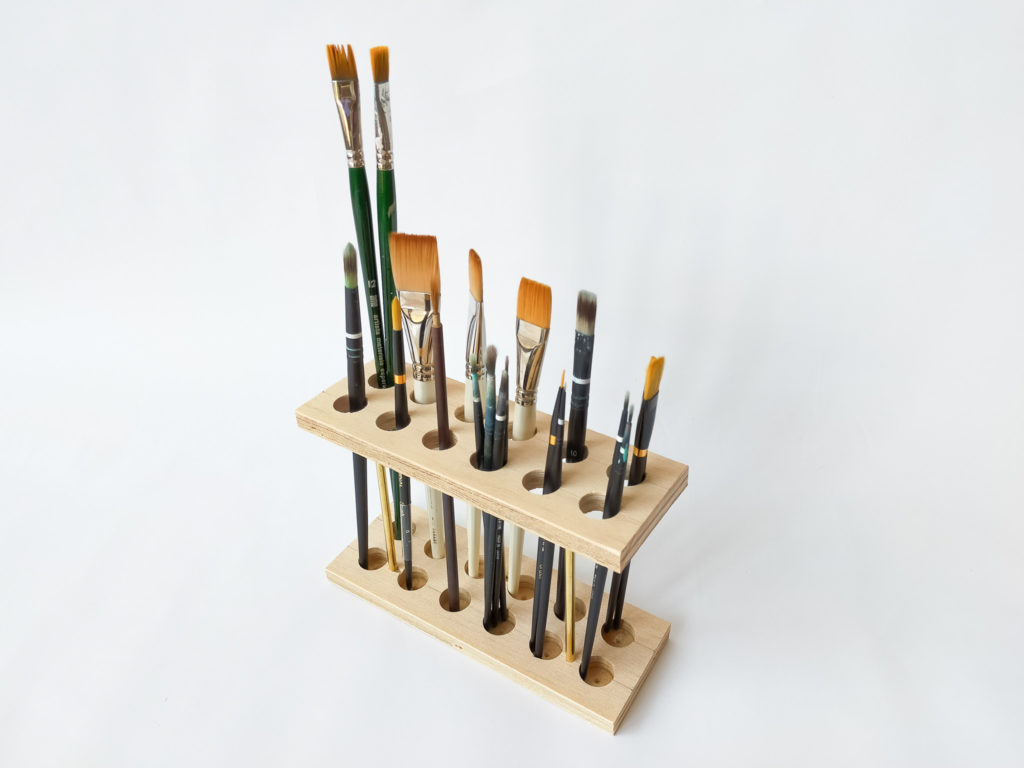 制作のきっかけは、電動ドリルと20mm径のドリルビットを購入し、木材に穴をあける練習をしていたところ、無作為に空けられた複数の穴が、筆やペンを収める構造として機能することに気づき、即興的に試作した。