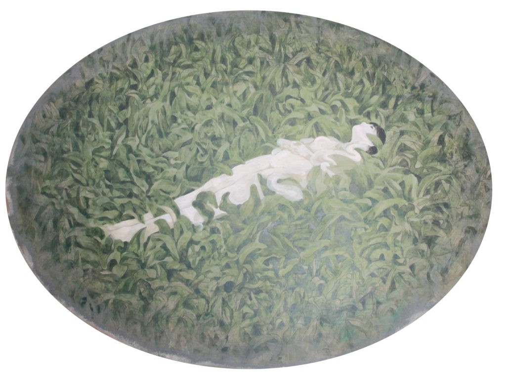 「草」パネルに綿布・アクリル絵の具、143cm(横)107cm(縦)の楕円
